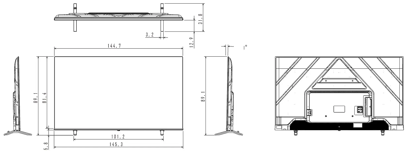 外形寸法(スタンド付き) 幅×高さ×奥行 | 145.3cmx89.1cmx31.8cm |