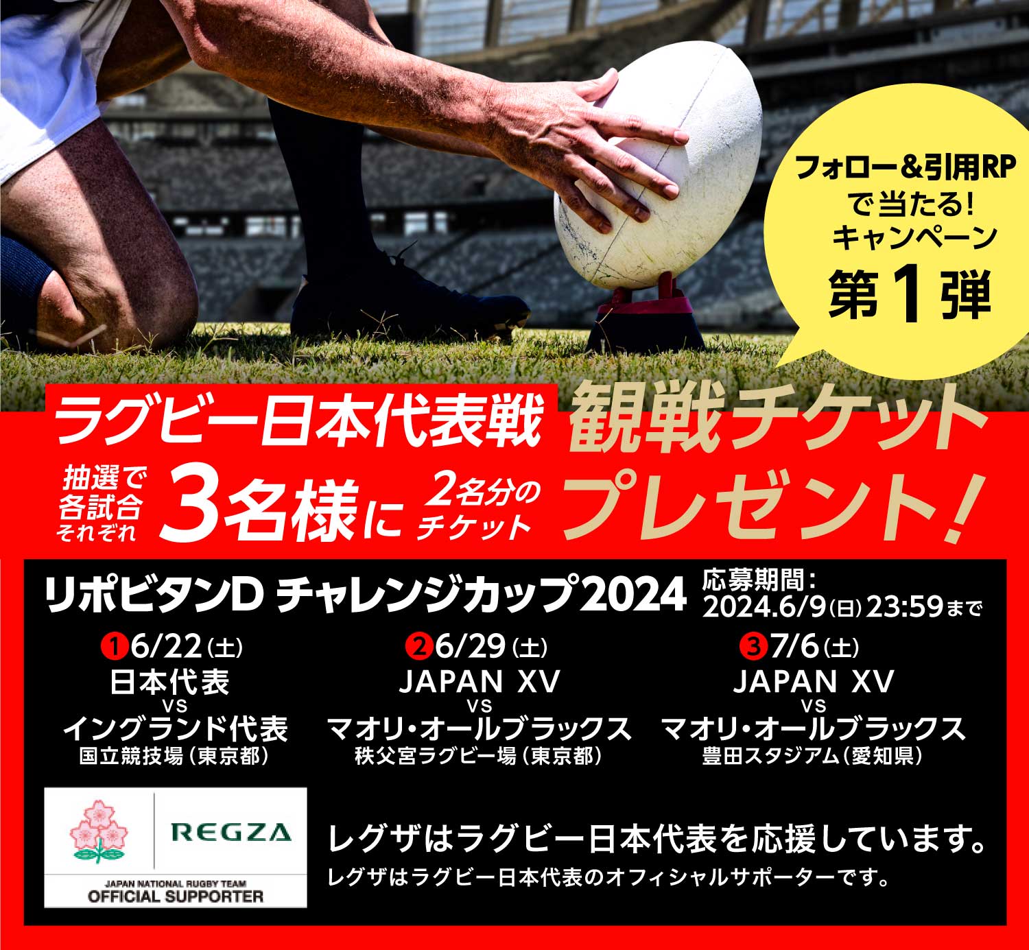 TVS REGZA株式会社(以下、「当社」といいます。)が主催する「ラグビー日本代表戦 観戦チケットプレゼントキャンペーン 第1弾」(以下、「本キャンペーン」といいます。)に応募いただく前に、本規約をよくお読みいただき、同意のうえ、応募ください。本キャンペーンに応募された場合、本規約に同意いただいたものとみなします。