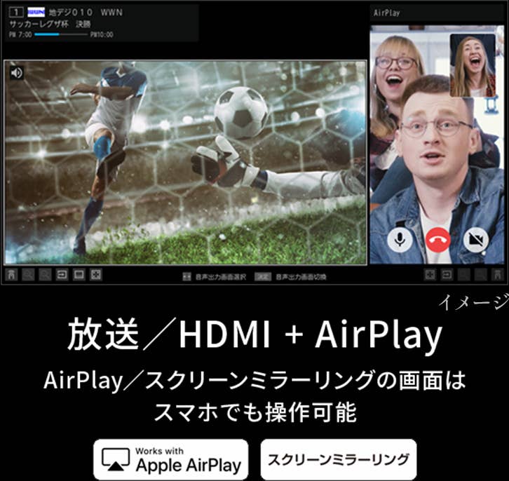 放送/HDMIと放送の組み合わせはもちろん、YouTube、AirPlay、スクリーンミラーリングとの2画面にも対応。