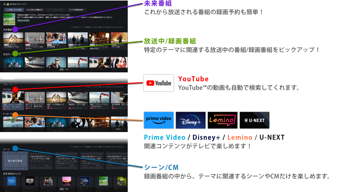 ※ シーン情報は、「関東」「東海(静岡県除く)」「関西」地区で放送されているNHK総合、Eテレ(ともに関東の場合は「NHK放送センター」、東海の場合は「NHK名古屋放送局」、関西の場合は「NHK大阪放送局」から放送された番組)、および民放キー局の地上デジタル放送の番組に対応しています。それ以外の地域では、NHK総合、Eテレ(ともに「NHK放送センター」から放送された番組)、および関東の民放キー局で放送されている同時刻放送番組に対応しています。ただし、番組によっては、本機能が正しく動作しない場合があります。
