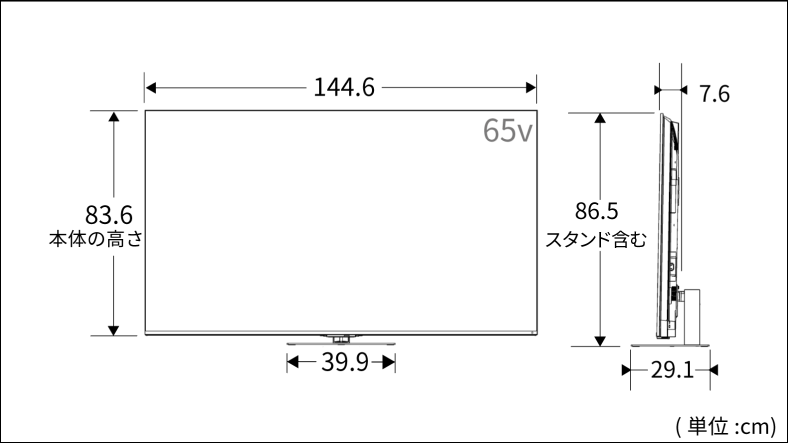 外形寸法(スタンド付き) | 幅 144.6cm,高さ (低)86.5cm/(高)89.5cm,奥行 29.1cm |