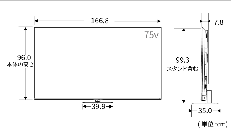 外形寸法(スタンド付き) | 幅 166.8cm,高さ (低)99.3cm/(高)102.3cm,奥行 35.0cm |