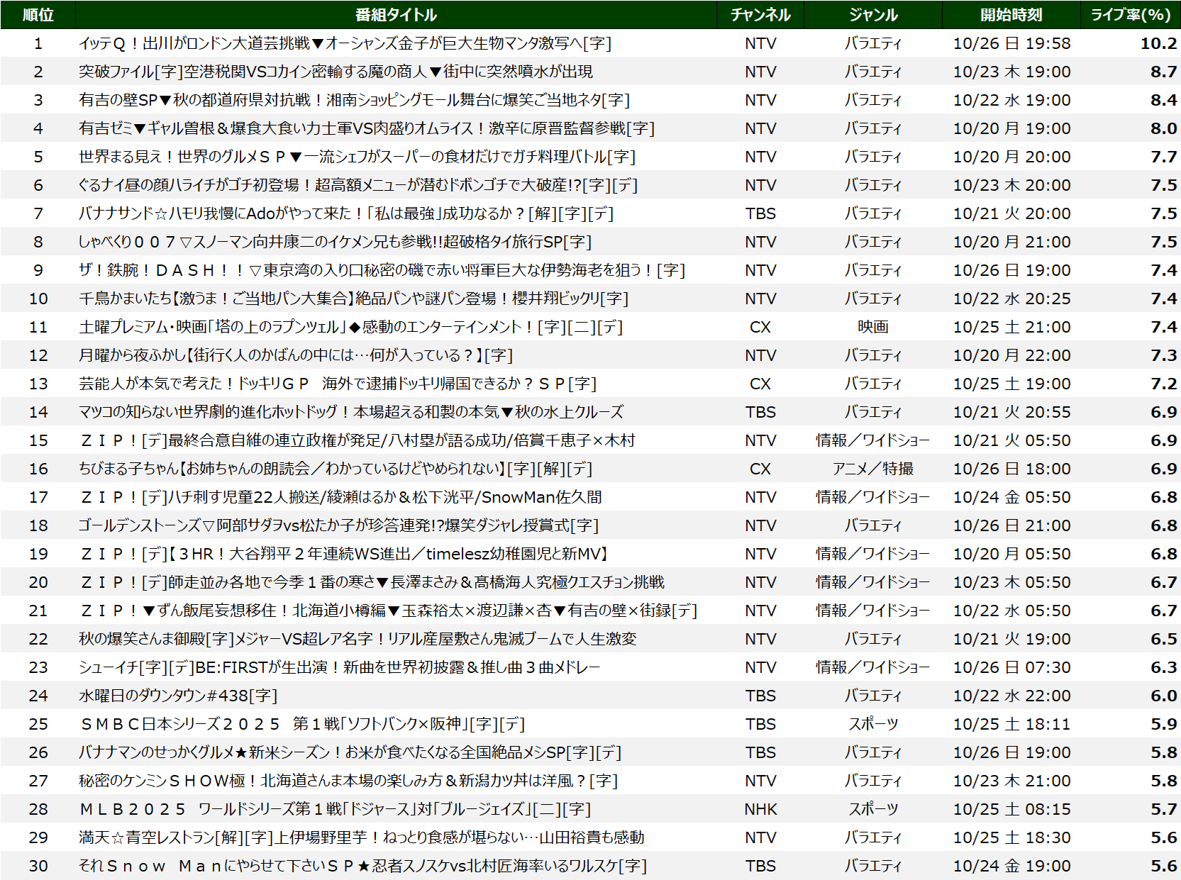 2025/10/20 (月) ~ 10/26 (日) リアルタイム視聴ランキング