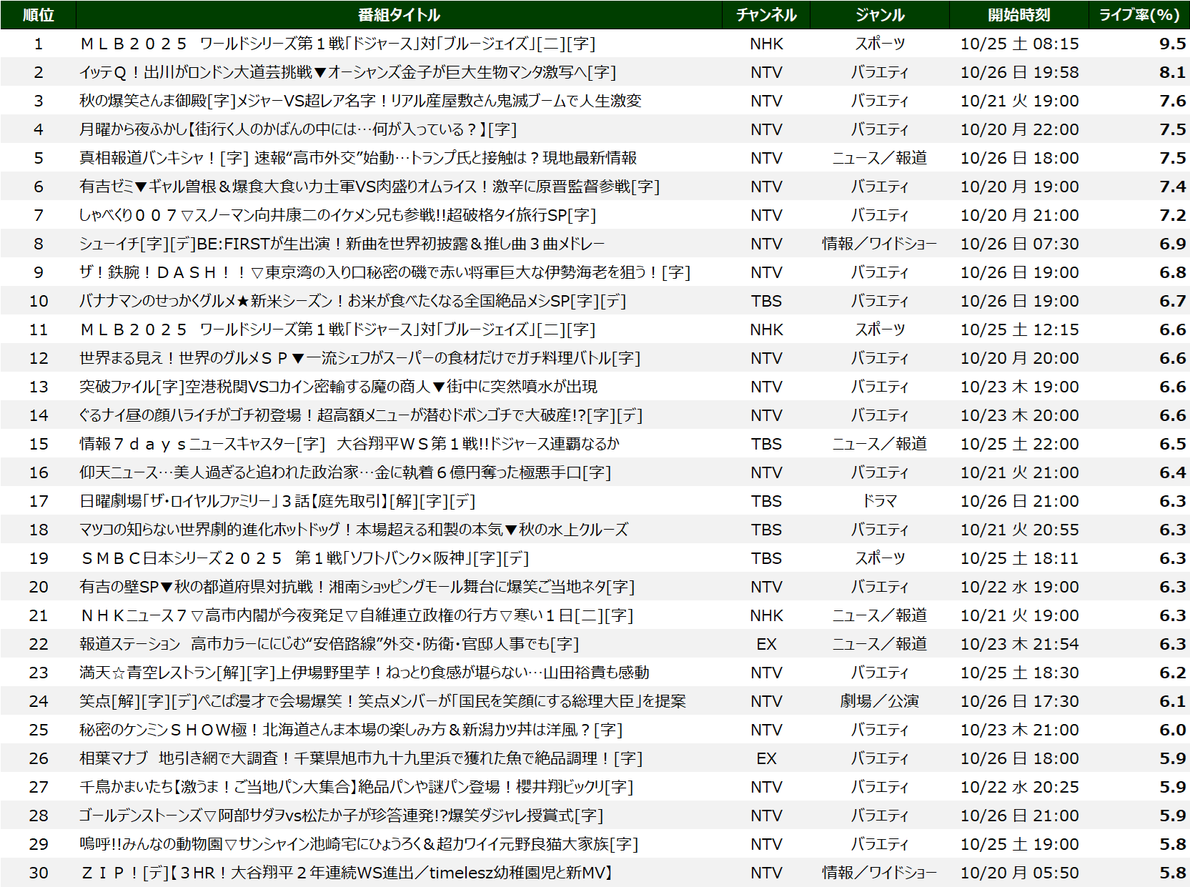 ・MLB ワールドシリーズ第1戦(NHK)が9.5%でトップ