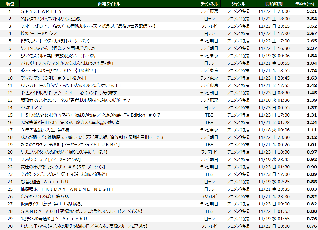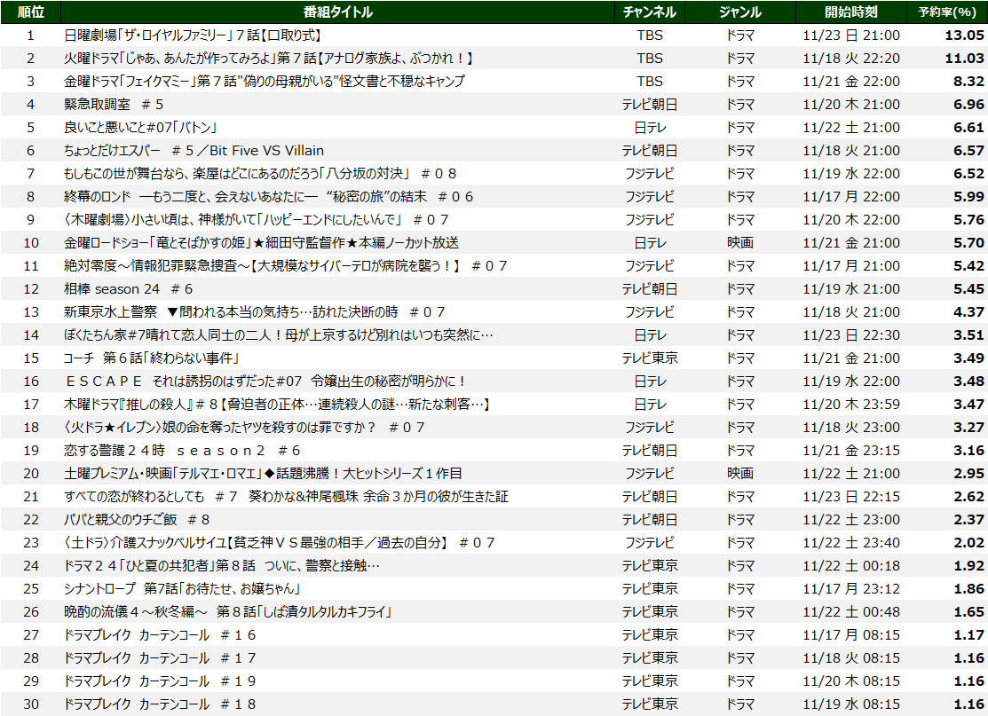 2025年11月17日(月)~11月23日(日) 録画予約ランキング