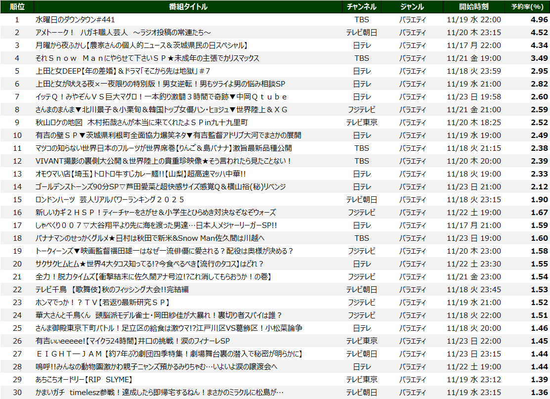 視聴者が「確実に見たい」番組はどれ?テレビ番組予約 週間ランキング[2025/11/17~11/23]