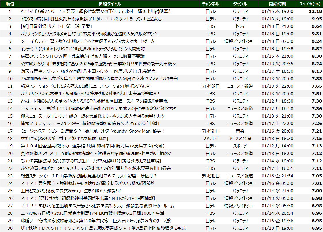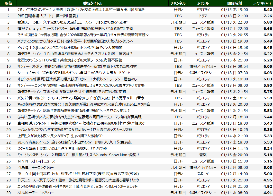 2026/1/12 (月) ~ 1/18 (日) リアルタイム視聴ランキング